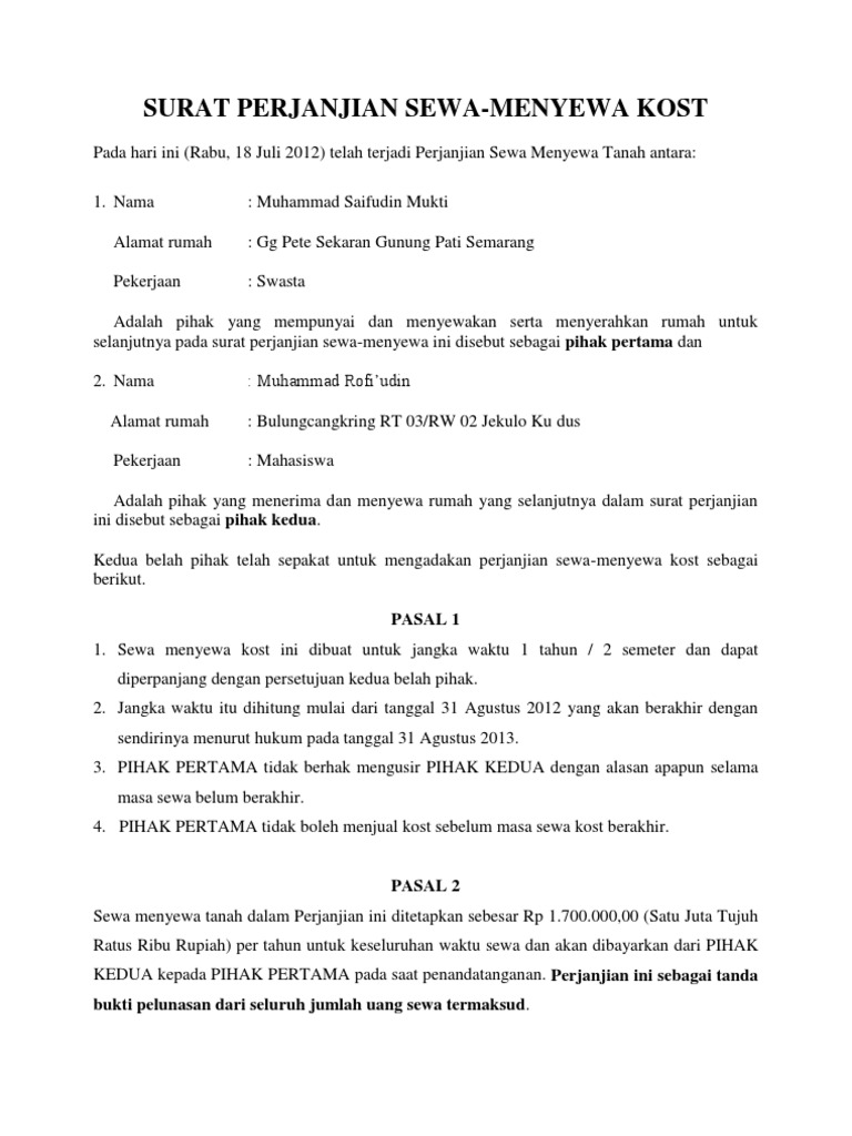 Surat Perjanjian Sewa Kost Pdf